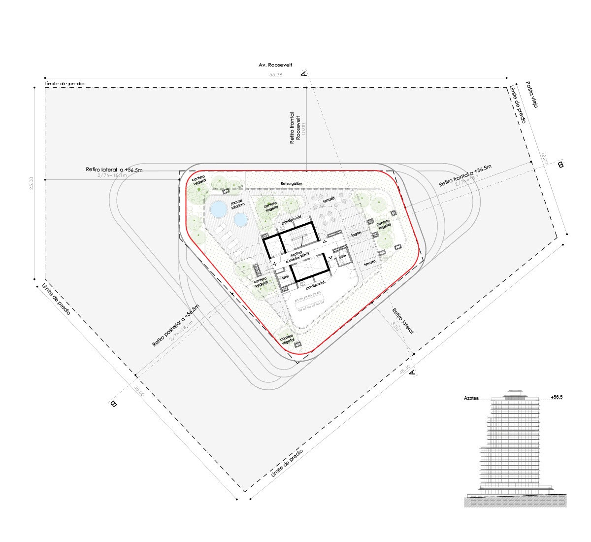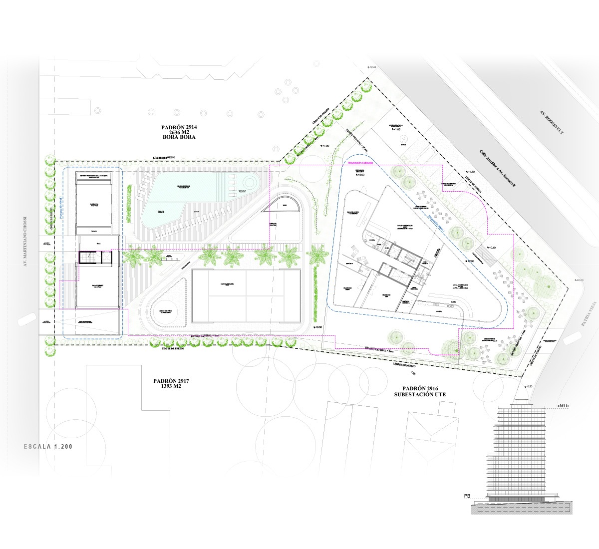 Se desarrolla sobre 3.500 m², con salida a Av. Martiniano Chiossi y 50 metros de frente sobre Av. Roosevelt